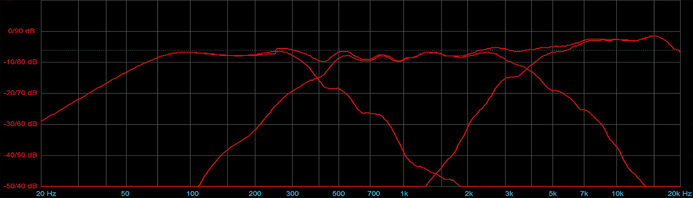 Die Frequenzweiche wurde auf eine neutrale Auslegung des Box hin abgestimmt. Im Interesse eines etwas höheren Wirkungsgrades wurde auf eine vollständige Kompensation des Baffle Step verzichtet. Die dadruch bei freier Aufstellung etwas zurückhaltend wirkende Basswiedergabe ist bei wandnaher Aufstellung oder Aufstellung im ansonsten auch gut gefüllten Regal kaum zu merken. Der Bass klingt trocken und spritzig. Wer dennoch eine noch kräftigere Basswiedergabe wünscht, kann dies leicht durch einen aktiven Bass-EQ mit +6dB / 35 Hz (HP2Ord. ~ Qhp = 2, fhp = 35 Hz) erreichen.