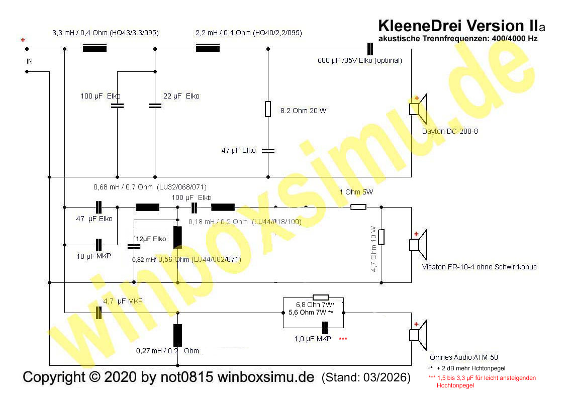 Für eine etwas mehr höhenbetonte Wiedergabe (+ 2 bis +4 dB) ist nur der Parallelwiderstand des Spannungsteilers im Hochtonzweig auf ca. 12 - 22 Ohm anzupassen. Aktuelle Weichen-Updates (12/2020) / (03/2026) sind weiter unten zu finden.